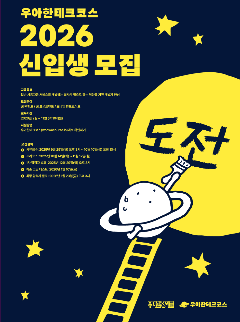 ‘우아한테크코스’의 2026년(8기) 신입생 모집 (배달의민족/우아한형제들) | |||||